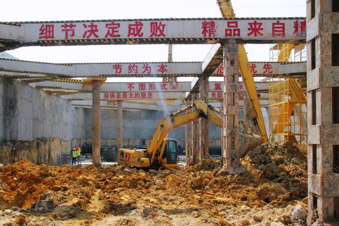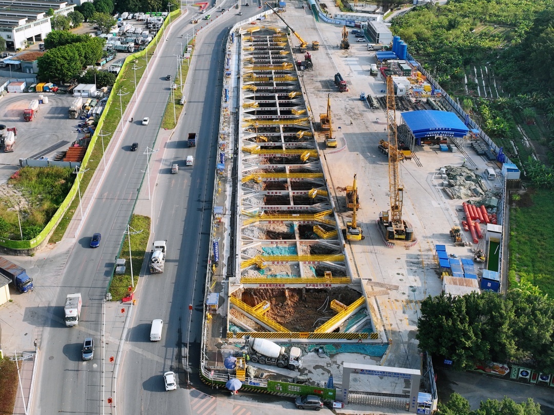 为保障基坑开挖工作顺利开展,广州地铁结合水沥站地质情况和施工特点制定施工方案,并召开专家评审会对方案进行优化,统筹调度现场人员、材料、机械,确保每个施工环节高效运转。针对侧壁渗漏风险的问题,基坑墙壁采用了钢管支撑和混凝土抹面,有效防止渗漏的同时也优化了现场施工环境。此外,基于水沥站的极端地质条件和紧邻公路主干道的位置特点,车站采用旋挖钻机引孔、成槽机土层抓取与双轮铣槽机岩层成槽的联合作业模式,配合混凝土及钢支撑结合的支护方式,最大程度防范涌水涌砂风险。