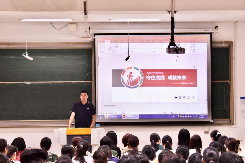 为提升新生自我保护和应急处理能力,确保学生度过一个平安、健康的大学生活,学校保卫处应邀作“守住底线 成就未来”安全教育系列讲座,向新生讲解关于人身安全、财产安全、宿舍安全、交通安全、食品安全、卫生健康、网络安全、国家安全、宗教知识与健康信仰等方面的安全知识。学校心理健康中心葛洁洁老师以“格罗应列车发车记”为题,作了心理安全专题教育,帮助新生摆脱入学初期心理困惑,引导广大新生储备心理知识、进行合理预期、提前应对心理问题。地科院学工办主任张朝喜、辅导员陈泉键以人身财产安全和防范电信网络诈骗为重点,分析了大家身边潜在的安全风险,提出了行之有效的防范措施。同时结合校园真实案例,强调学生在日常生活中的“安全思维”与“底线思维”,倡议大家注意安全隐患,提高警惕意识。
