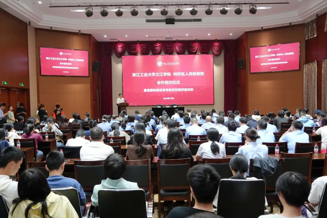 为进一步推动检察实践和理论研究深度融合,实现司法资源和教育资源优势互补,促进高层次法治人才培养,建立常态化、制度化检校合作关系,10月21日,绍兴市柯桥区检察院与浙江工业大学之江学院共同举办检校合作签约仪式暨首期检察官进校园实务讲座。该院党组书记、检察长钱昌夫,之江学院党委书记何作井出席活动并致辞。之江学院领导,柯桥区检察院领导班子及部门负责人,该区法院、区公安分局、区律师协会代表以及之江学院教师学生代表参会。