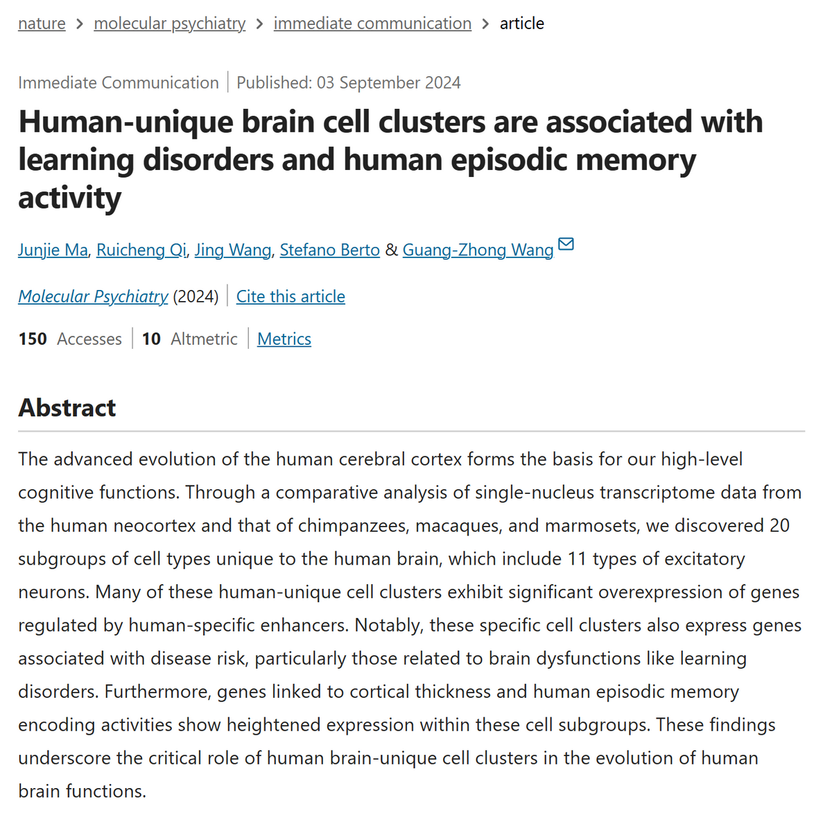 2.Ma J, Qi R, Wang J, Berto S, Wang G. Human-unique brain cell clusters are associated with learning disorders and human episodic memory activity. Molecular Psychiatry. 2024. PMID: 39227435