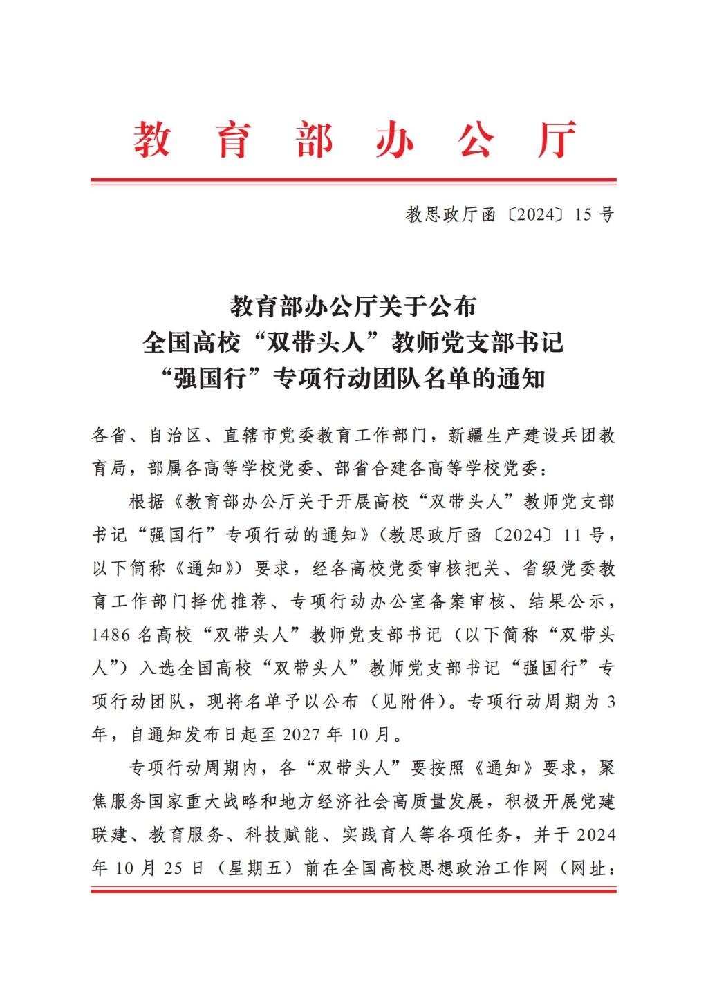 近日,教育部办公厅印发《教育部办公厅关于公布全国高校 “双带头人”教师党支部书记 “强国行”专项行动团队名单的通知》(教思政厅函 〔2024〕15 号),河南财政金融学院体育与健康管理学院教师第一党支部入选全国专项行动团队。
