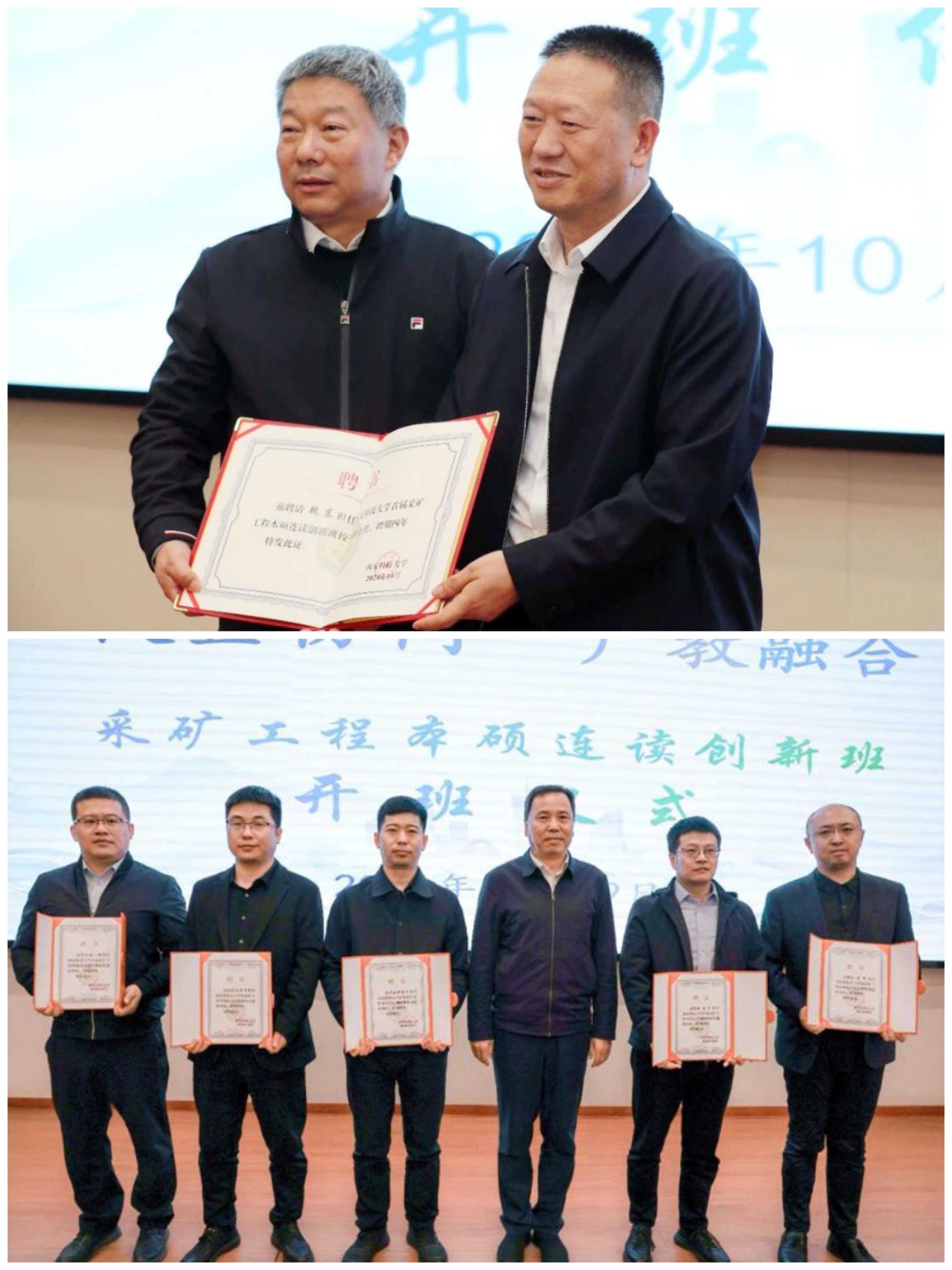 会上,学校分别聘请来兴平担任首届采矿工程本硕连读创新班班主任,魏东担任校外班主任;同时,聘请赵一超、赵象卓、张俊星、艾川、崔峰五位延长石油矿业公司技术创新能手担任校外创新导师。来兴平与陈春林分别为他们颁发了聘书。