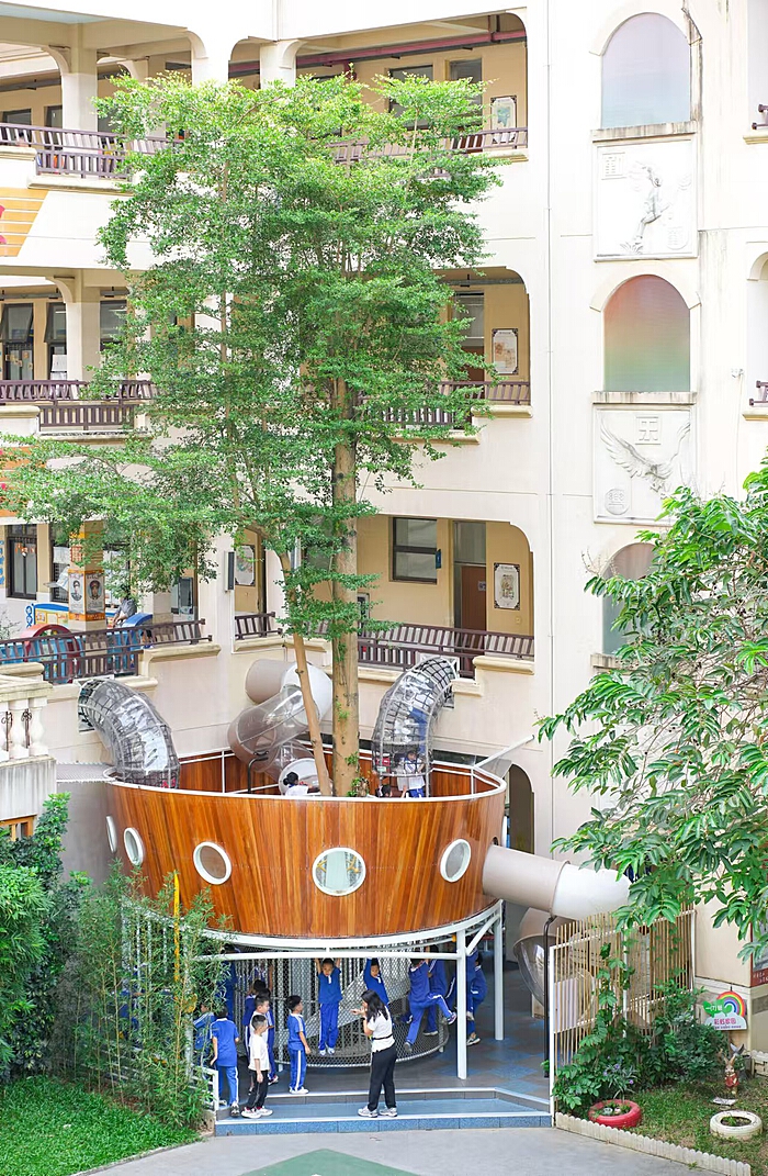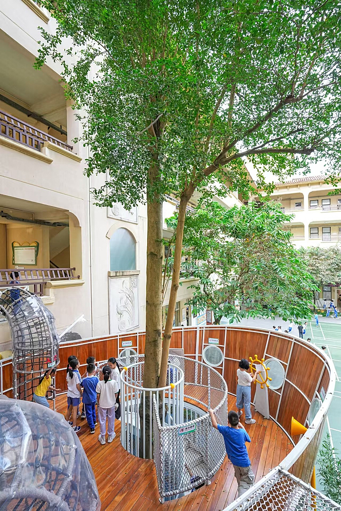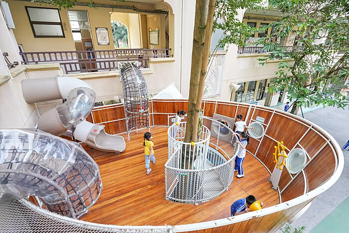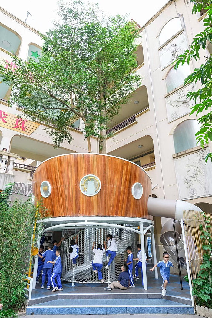 游乐场从去年开始筹备,历经一年半的时间最终落地,设计稿反复修改了近10次。建设完后,宋冰还带着不同身形的教师和学生专门测试,他也爬了两次树屋的垂直管道,检验设施的安全性。