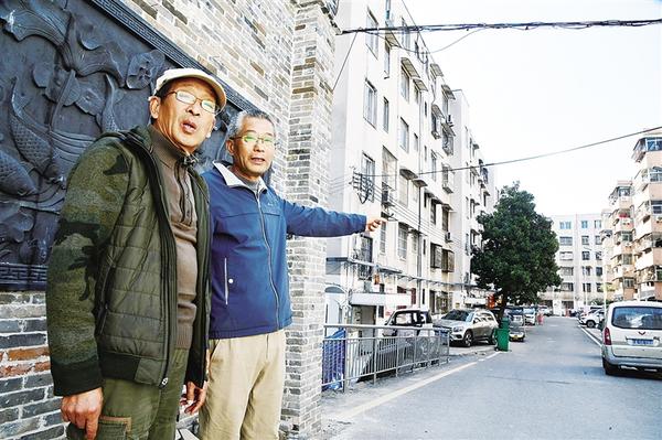 王文锦的侄子王光新(左)、王光霁所指两楼之间的位置为王家大院旧址。