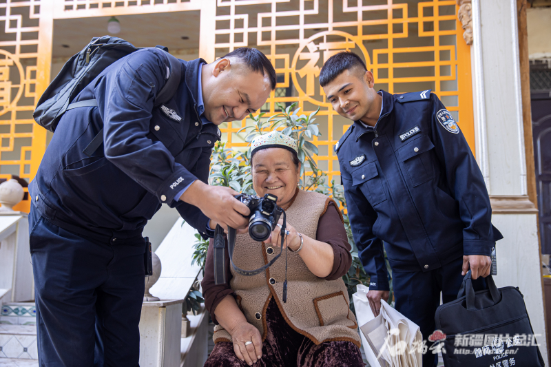 10月25日,伽师县公安局和夏阿瓦提派出所民警吾拉恩·巴合达提(左)和同事来到托玛贝希村为行动不便的布女士拍摄身份证照片,让老人挑选相机里的“美图”。高坤摄