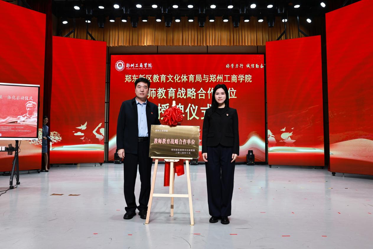 为进一步深化产教融合、构建开放合作的教师教育平台,启动仪式上,郑州市郑东新区教育文化体育局与郑州工商学院举行了教师教育战略合作单位的揭牌仪式。张利刚和王提共同上台揭牌。这标志着双方将在教师教育领域展开深度合作,共同培养高素质专业化创新型教师。