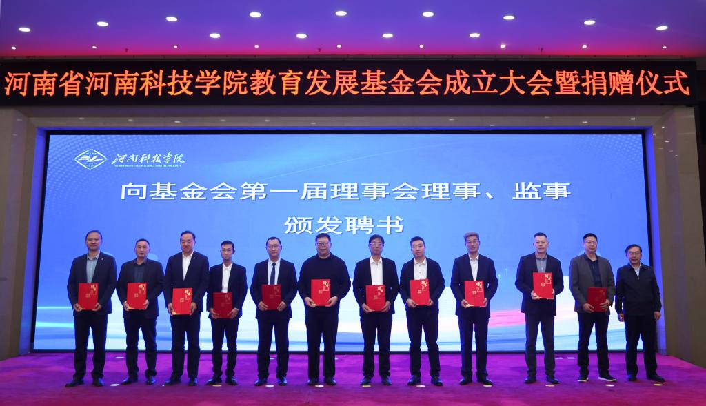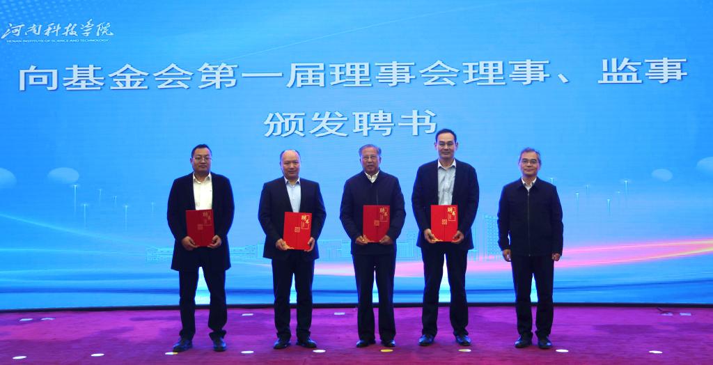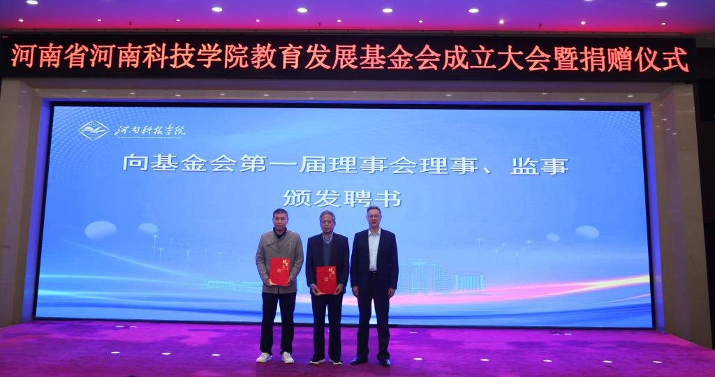 会上,王庆兵、姚刚、刘全永、马金友按议程宣读了河南省民政厅关于河南省河南科技学院教育发展基金会成立的批复,向基金会第一届理事会理事、监事颁发聘书,代表学校接受捐赠并向捐赠企业、捐赠校友颁发捐赠证书。