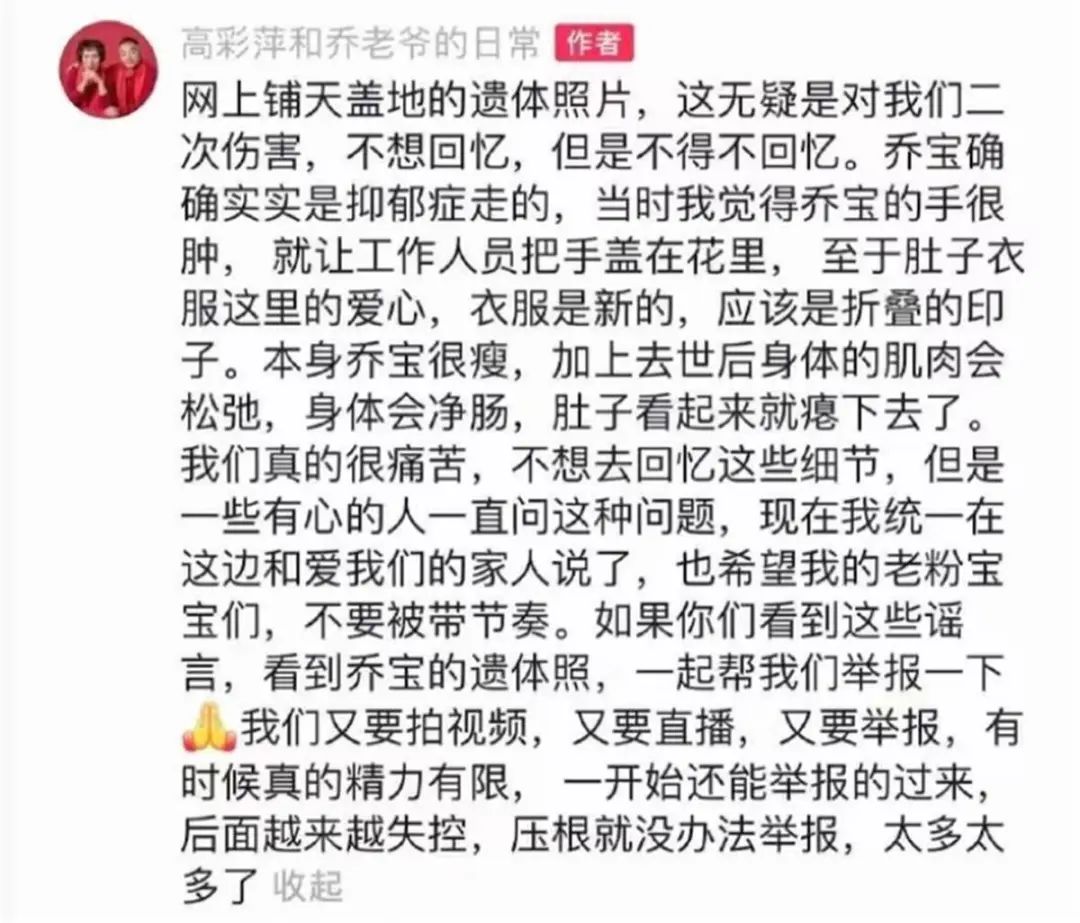 今(31)日,乔任梁的父母在个人社交媒体发出文字,表示:“网上铺天盖地的遗体照片,这无疑是对我们二次伤害,不想回忆,但是不得不回忆。乔宝确确实实是抑郁症走的,当时我觉得乔宝的手很肿,就让工作人员把手盖在花里……我们真的很痛苦,不想去回忆这些细节,但是一些有心的人一直问这种问题,现在我统一在这边和爱我们的家人说了,也希望我的老粉宝宝们,不要被带节奏。”