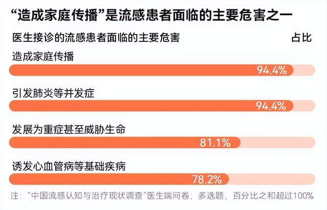 流感季节,每个人都是防控链条上的重要一环。中华医学会儿科学分会感染学组副组长、浙江大学医学院附属儿童医院感染科副主任陈英虎教授强调,家庭也是流感流行的常见场景。《报告》显示,94.4%的医生认为“造成家庭传播”是流感患者面临的主要危害,与“引发肺炎等并发症”并列第一。
