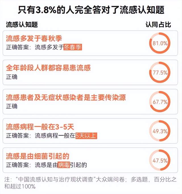 流感不是普通感冒。《报告》显示,超过98%医生认同相比普通感冒,“流感会引发高热、全身疼痛、乏力等全身症状”,且“流感存在季节流行性”、“易引发肺炎、心肌炎等并发症”。但超过两成的大众受访者在出现疑似流感症状时,直接针对高烧、头痛等症状“对症下药”,忽视了背后真正的主因是流感病毒。要知道,如果仅使用普通感冒药或退烧药来治疗流感,可能会错过最佳治疗时机,增加并发症风险。这种认知误区可能导致对流感的轻视,进而让患者在感染后承受更多痛苦。