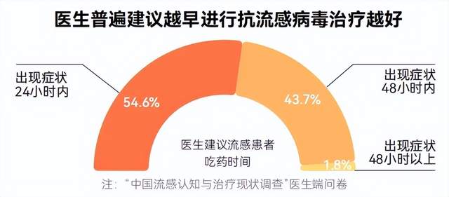 《报告》提示,医生普遍建议越早进行抗病毒治疗越好:54.6%的医生建议24小时内进行抗病毒治疗,扼杀病毒复制能力。还有43.7% 的医生建议在48小时内使用抗流感药。超八成医生认为,更早治疗有助于减少重症、缩短病程及减少并发症,尤其是流感重症高危人群要抓紧流感治疗的黄金时间。