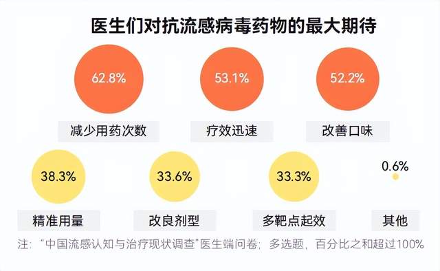 对于抗流感病毒药物的未来,医生们纷纷提出了自己的期待,《报告》显示,医生最希望抗流感病毒药物能在以下三方面进行改进:“减少用药次数”、“疗效迅速”、“改善口味”,占比分别为62.8%、53.1% 和52.2%。