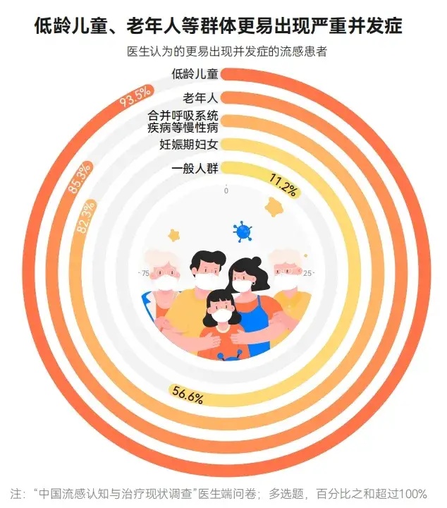 中华医学会儿科学分会儿童感染学组副组长、首都医科大学附属北京儿童医院感染与病毒研究室主任谢正德教授指出,流感是每年冬春季呼吸道传染病防控的重中之重,而5岁以下儿童是流感的高危人群,感染流感后易发生重症,疾病负担巨大。《报告》显示,93.5%的医生指出,5岁以下低龄儿童在感染流感后更易出现严重并发症。