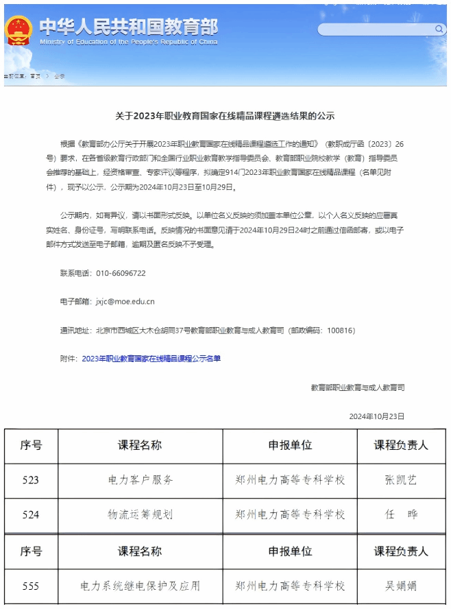 教育部职业教育与成人教育司近日发布《关于2023年职业教育国家在线精品课程遴选结果的公示》,学校《电力系统继电保护及应用》等3门课程获评国家在线精品课程。此次遴选拟确定914门课程,其中,河南学校52门课程入选。