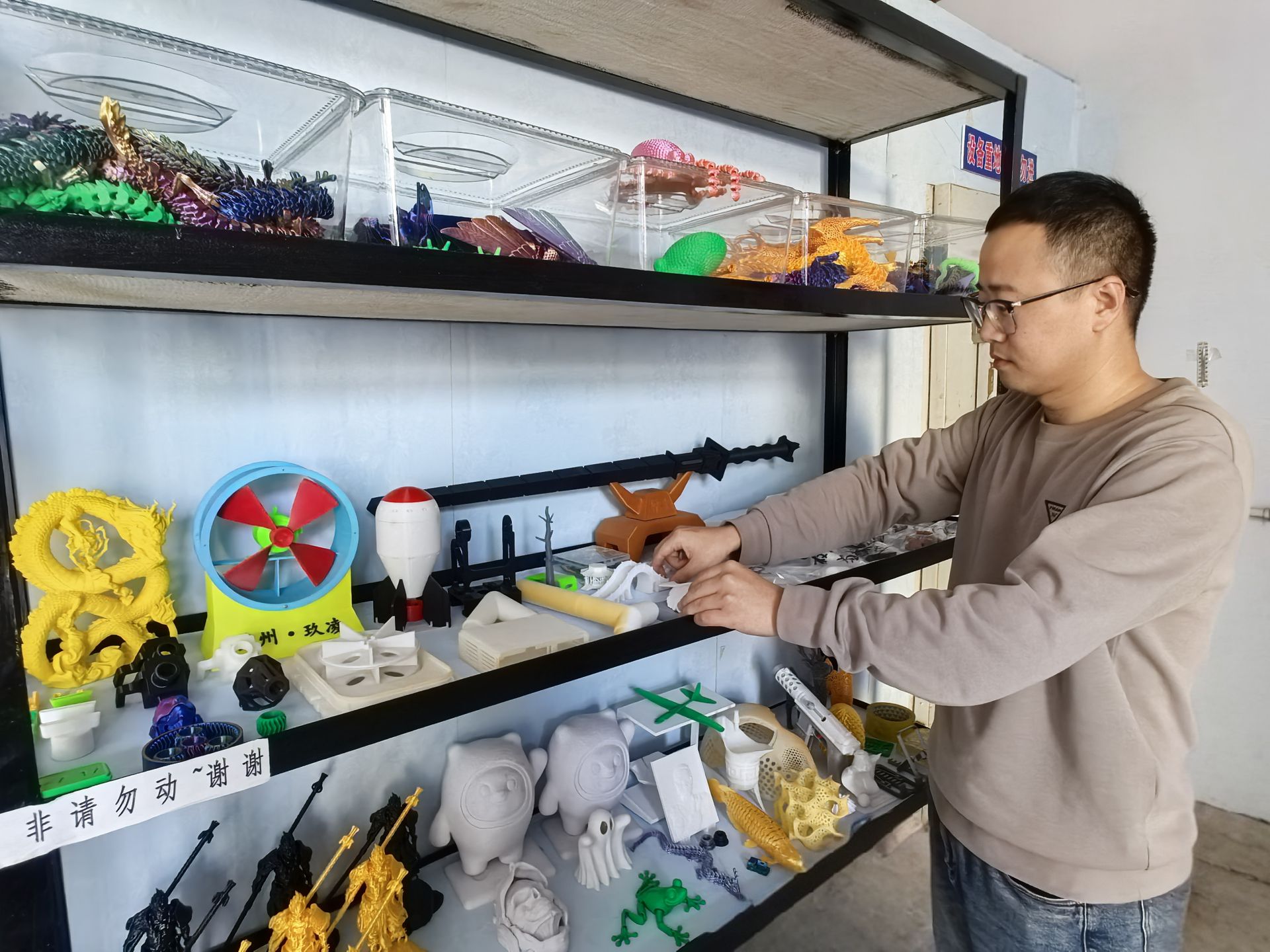 和家人商量后,张振龙专门定制了两个货架,生产一些更贴近日常生活的产品,摆放在工作室的显眼位置。可以扭动的中国龙、具有镭射风格的孙悟空、颜色各异的草莓熊……价格从10元到百元不等,不少前来打印的顾客被吸引,买回家当作装饰品。