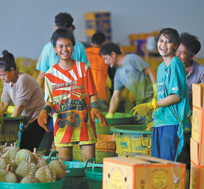 在优果东明水果厂,当地工人对榴莲进行清洁处理。 本报记者 白元琪摄