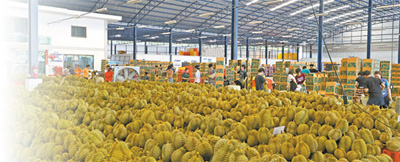 在位于泰国尖竹汶府的优果东明水果厂,经过分拣和清洁处理的榴莲按品级分类整齐堆放、等待装箱。 本报记者 白元琪摄