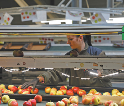 波兰格鲁耶茨县一家苹果加工企业内,当地工人正在分拣苹果。 本报记者 禹丽敏摄