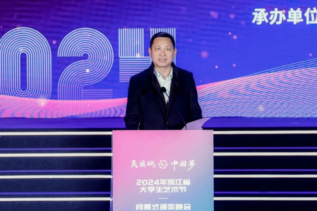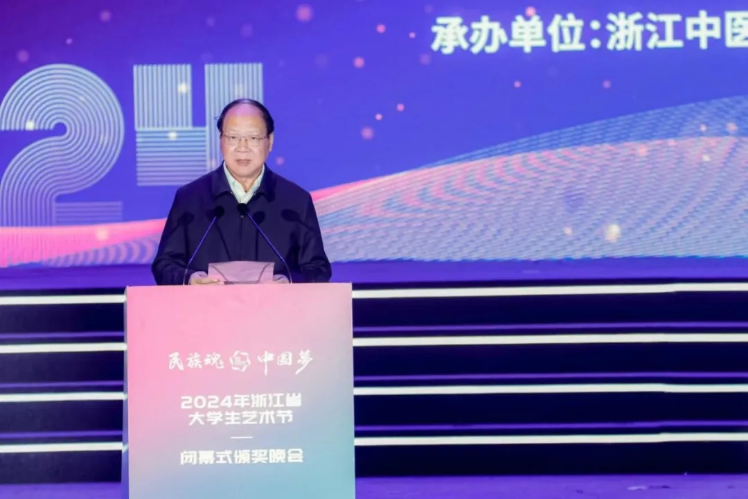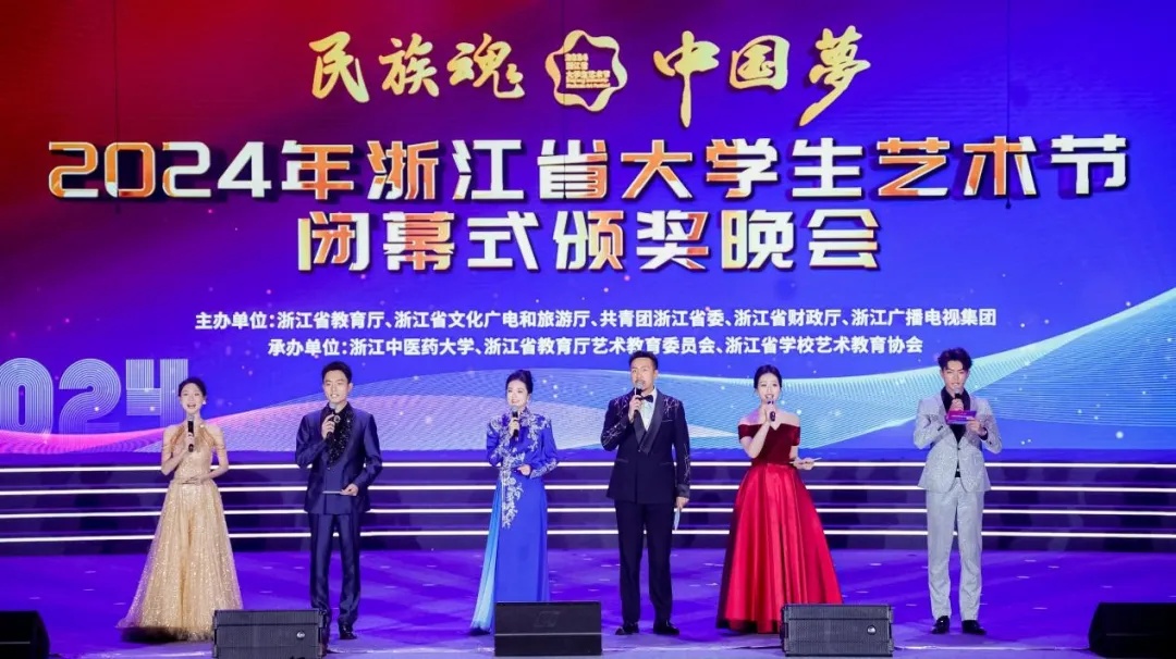 11月4日,“民族魂·中国梦”2024年浙江省大学生艺术节闭幕式颁奖晚会在浙江中医药大学隆重举行。浙江省教育厅党组成员、副厅长谢斌,浙江省文化广电和旅游厅二级巡视员林勇毅,共青团浙江省委副书记包志炎,浙江广电集团党委委员、副总编辑许东良,浙江中医药大学党委书记黄文秀和主办单位相关处室领导、各兄弟院校分管领导、师生代表出席闭幕式颁奖晚会。