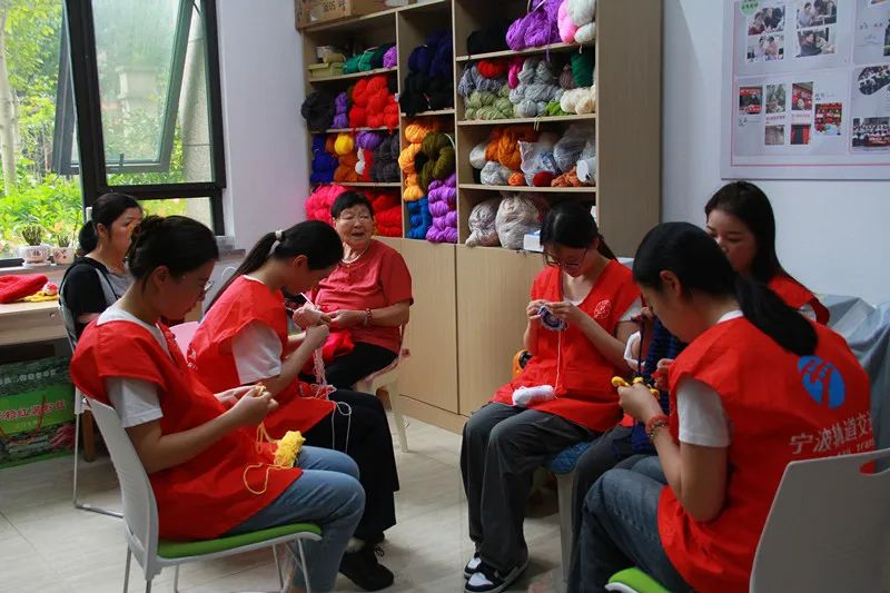 志愿者们与韩奶奶一起编织。