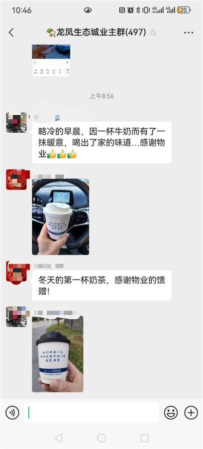 “略冷的早晨,因一杯牛奶而有了一抹暖意,喝出了家的味道……”“冬天的第一杯牛奶,感谢物业的馈赠。”在微信业主群里,大家纷纷点赞小区工作人员的辛勤付出。