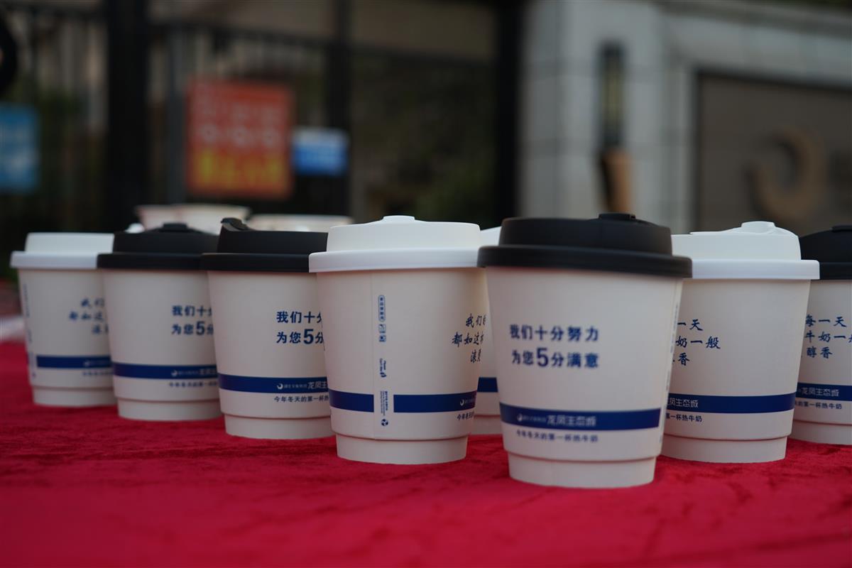 凌晨四点半,天还未亮,龙凤生态城各个园区内的工作人员便忙碌了起来。在安澜园营销中心,工作人员烧好热水、冲兑牛奶、装杯装箱,再将热腾腾的牛奶送到各个园区。在各园区的主要出入口,工作人员将一杯杯热腾腾的牛奶,送给小区学生、上班族、环卫工人和过往的务工人员。