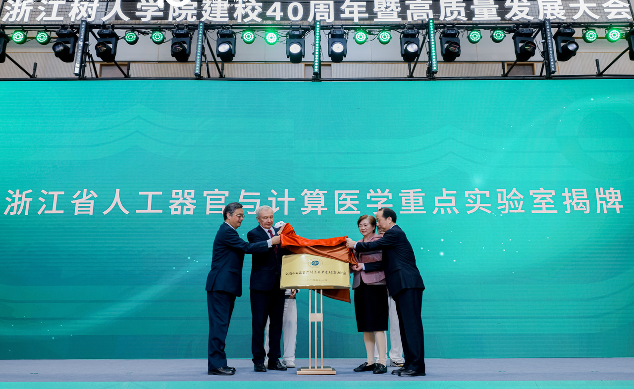 在大会现场,中国工程院院士李兰娟、白俄罗斯工程院院士谢尔盖·阿布拉梅科、浙江省政协办公厅主任单志强和浙江树人学院校长李鲁,中国工程院院士郑树森、中国科学院院士杨树锋、浙江省社科联党组书记郭华巍、浙江省人社厅二级巡视员俞韵为学校今年新获批的全省人工器官与计算医学重点实验室、智慧健康公共服务浙江省工程研究中心2个省部级科研平台揭牌。
