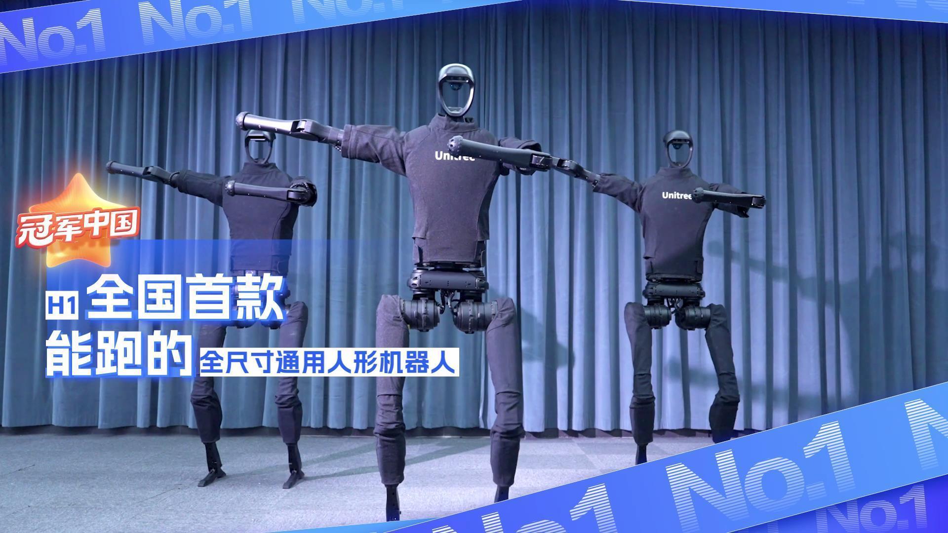 人形机器人H1——全国首款能跑的全尺寸通用人形机器人,身高180cm,体重约47kg,全身有20多个关节电机。Ta还是全球奔跑最快的全尺寸机器人,最快速度可达每秒3.3米。上下楼、后空翻、负重30kg,对H1来说都不是难事。