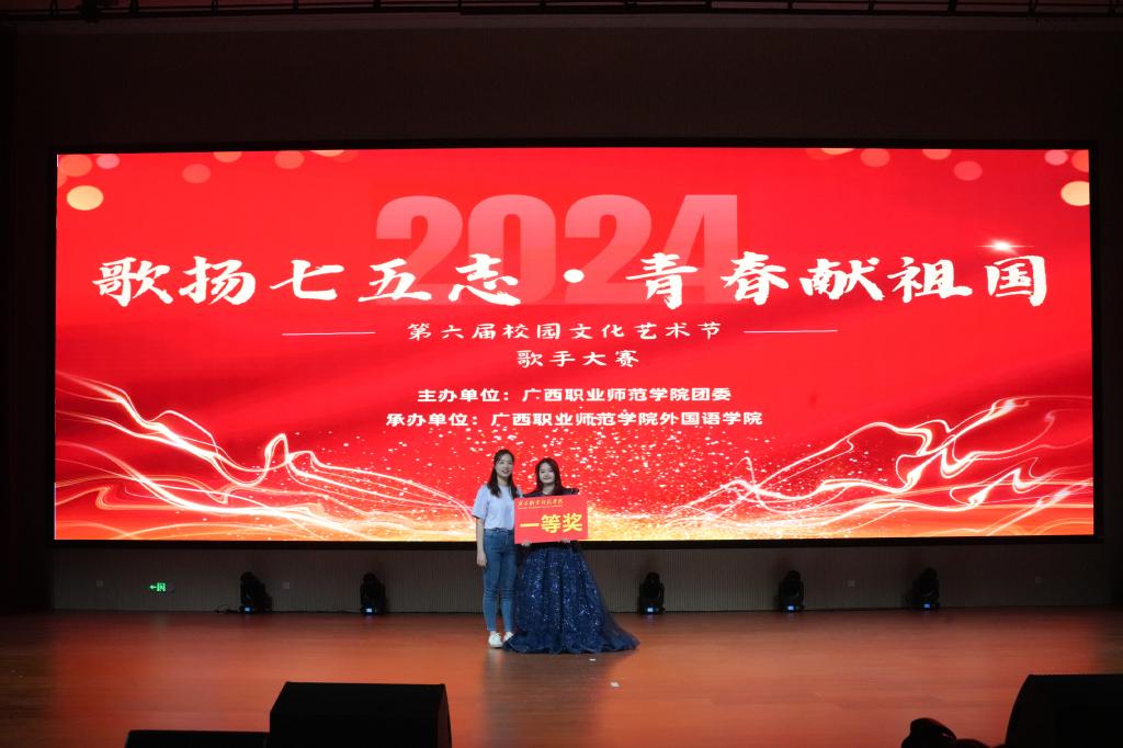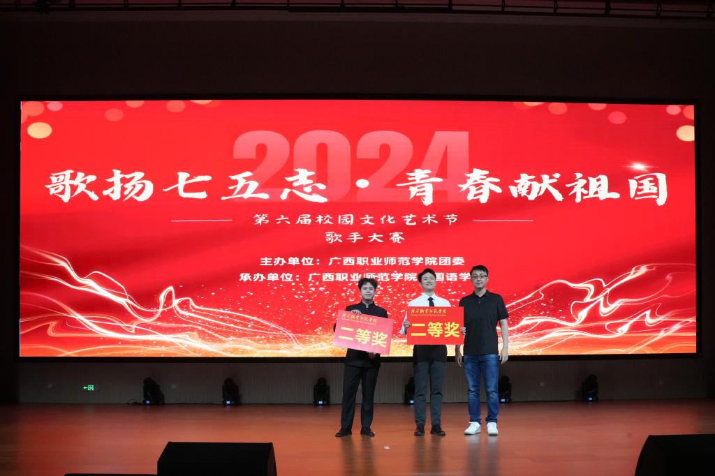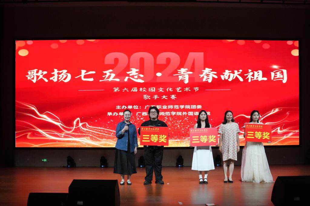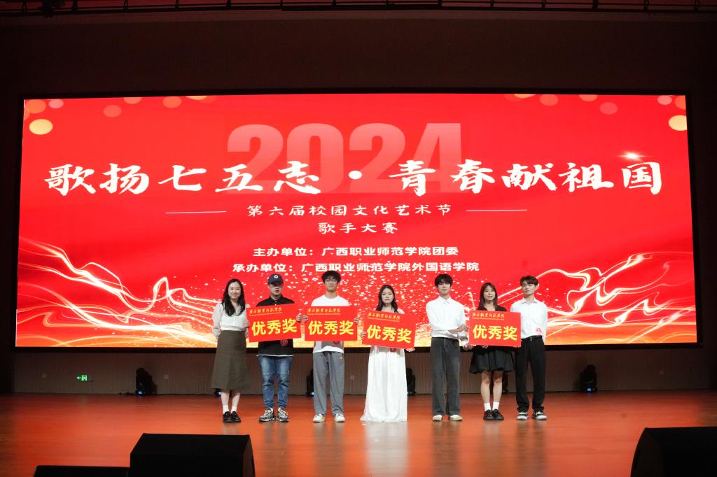 由广西职业师范学院团委主办、外国语学院分团委承办的第六届校园文化艺术节——“歌扬七五志 青春献祖国”歌手大赛于11月1日晚在罗文校区大学生活动中心举行,各学院师生代表700余人观看了比赛。