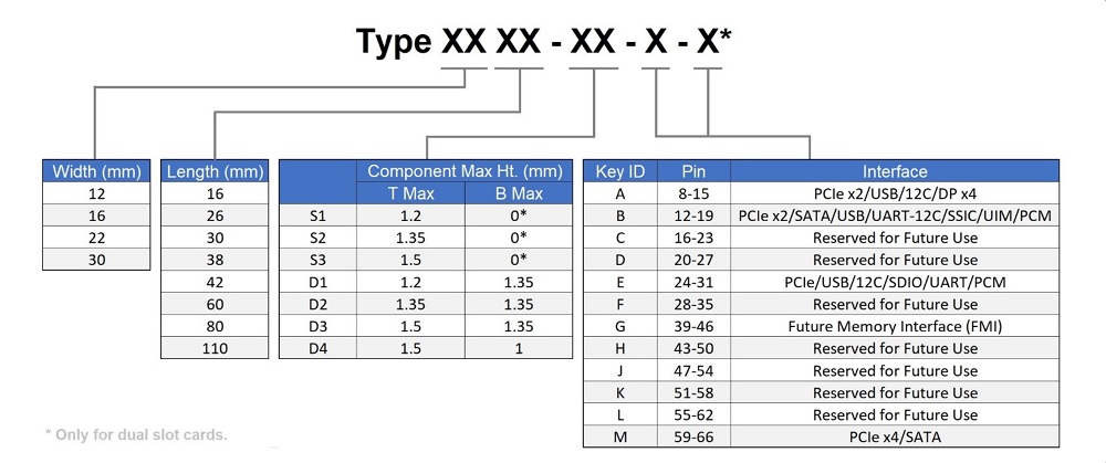 M.2接口的完整命名规范,应该是M.2 2XXX-XX-X-X。前两位数字指定宽度、第二个(或第三个)数字指定长度、最后一位字母用于指定键、接口和总线