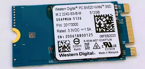 在2230规格(下图)中,由于长度仅有30毫米,设计师必须采用更高密度的PCB布线方案和更先进的闪存封装技术。这种紧凑的设计虽然牺牲了一定的容量潜力,但在游戏掌机等对体积要求极为苛刻的场景中具有不可替代的优势。值得注意的是,2230规格的散热压力相对较大,这要求主板设计时必须充分考虑散热路径的优化,或者用户自己购买散热贴片。