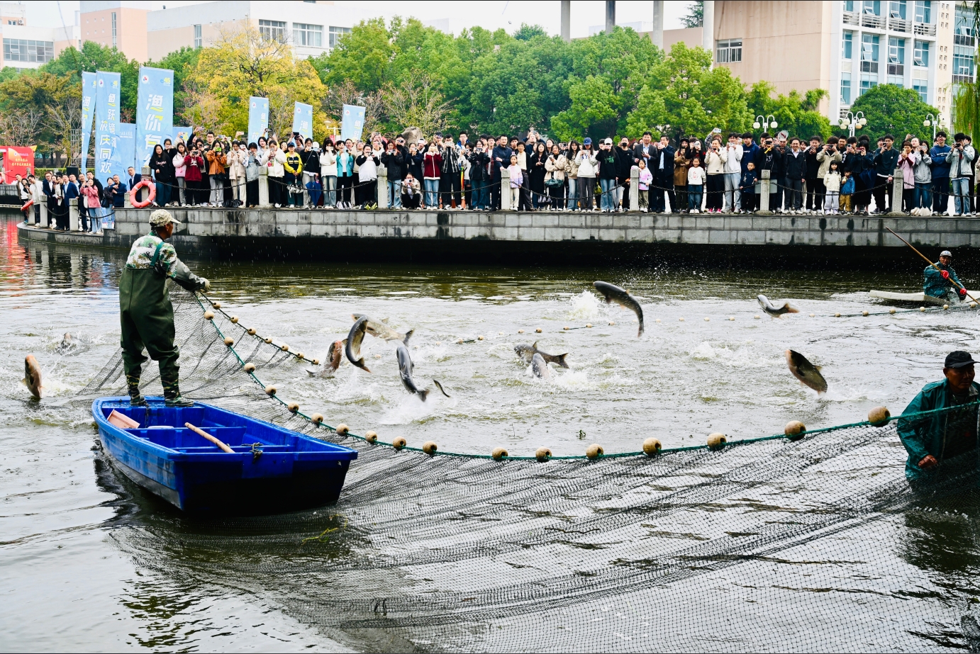 11月10日,湖州职业技术学院庆祝高等职业教育25周年暨办学45周年“渔你有约”第三届捕鱼节在镜湖广场举行,捕捞校园镜湖里的野生鱼,学校师生代表、校友300余人参加活动。
