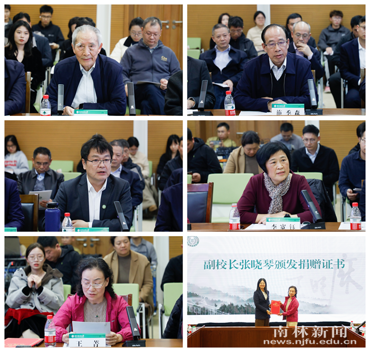 座谈会上,与会人员观看了《意杨葱葱庥人间》短片,回顾了王明庥院士爱国与奉献的一生。会上还举行了王明庥院士实物捐赠仪式,王明庥院士亲属将院士证书等255件珍贵实物捐赠给南京林业大学博物馆、档案馆。这不仅丰富了学校实物档案资源,更将为弘扬南林优秀学术传统发挥重要作用。张晓琴为王明庥院士家属代表颁发捐赠证书。