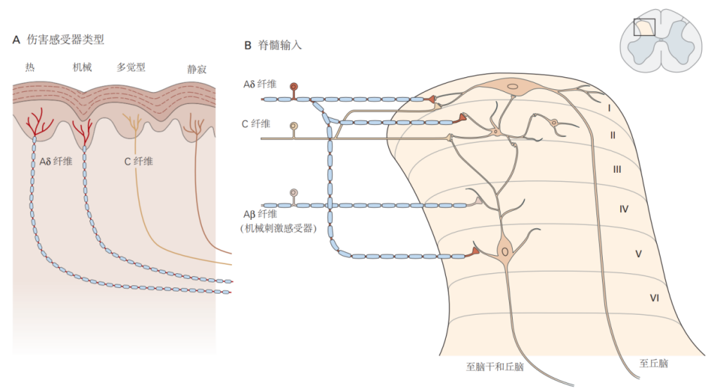 伤害感受器与痛觉的脊髓输入:不同的伤害感受器连着轴突纤维;脊髓背角 I 层中的神经元通过层 II 中的中间神经元接收来自有髓(Aδ)伤害感受纤维以及来自无髓(C)伤害感受纤维的输入。(图片来源:《Principles of neural science》)