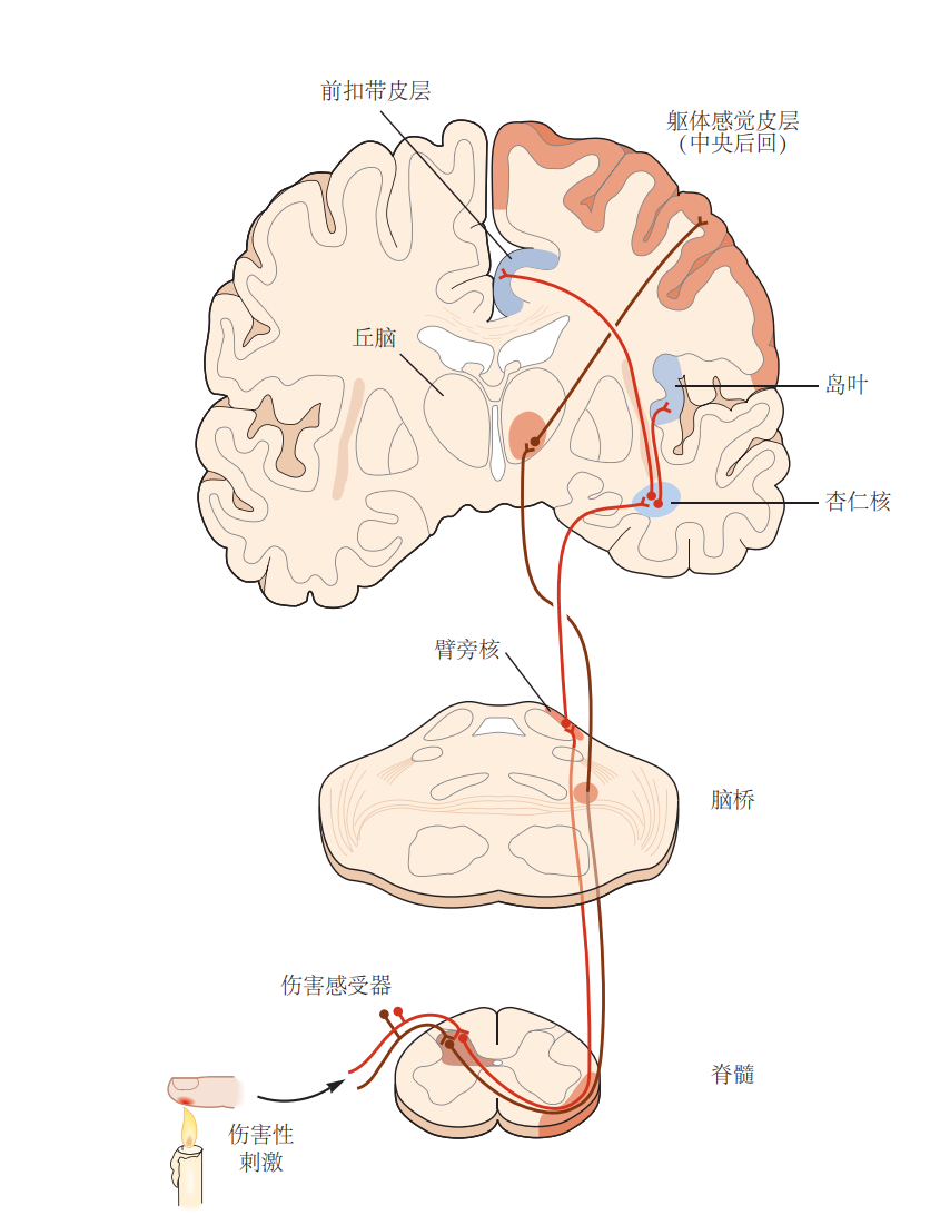 痛觉的传递上行路线,前扣带皮层和岛叶是处理痛觉信息终点的区域。(图片来源:《Principles of neural science》)