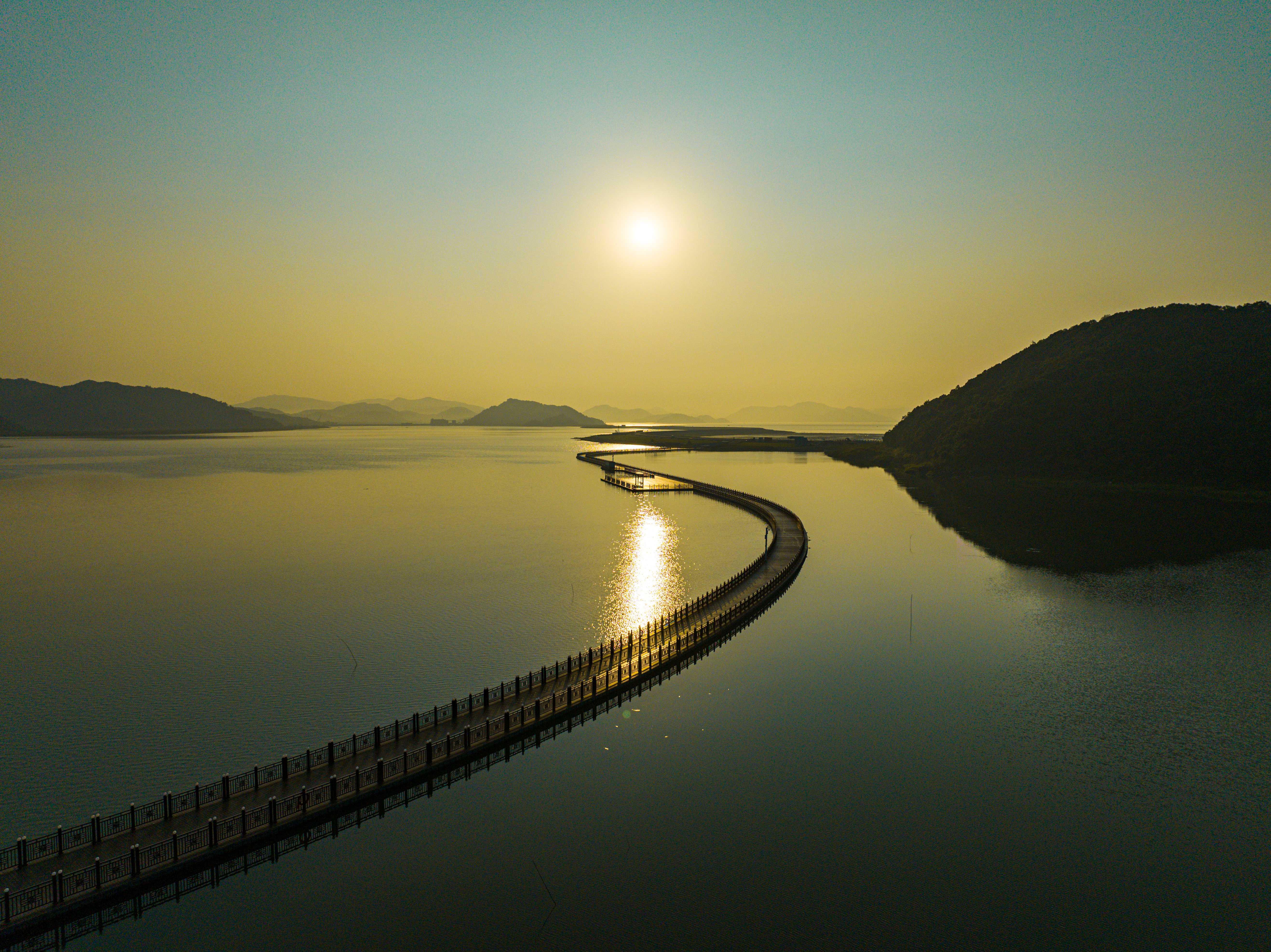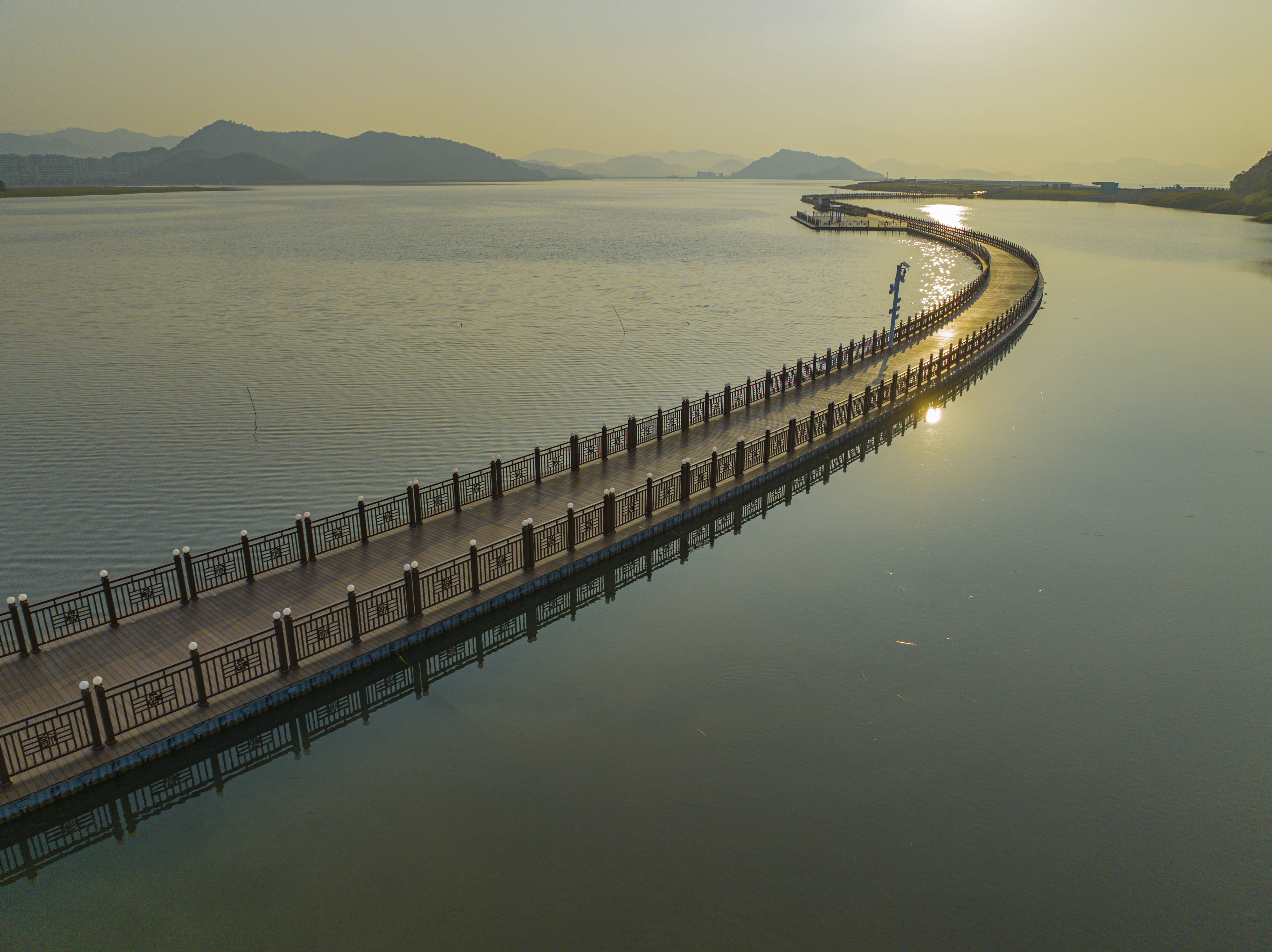 天妃湖福桥坐落于素有“东海福地、宁波蓝湾”之称的天妃湖畔,是浙江宁波湾省级旅游度假区的标志性项目之一。天妃湖福桥是一座海上车行文化景观休闲浮桥。该桥采用了专利锚固技术,即使遭遇台风等恶劣天气也可以有效控制浮桥整体安全性及稳定性,桥面铺设新型户外高强度环保耐腐蚀二代实心共挤木地板,整体配套灯光亮化系统,当夜晚灯光亮起时,桥体仿若一串华美的珍珠,浪漫恢宏,美不胜收。在设计上,该桥以“爱情”为主题,融入了“一见钟情,一生锁爱”的美好寓意,生动展现爱情从相识、相知、相恋到相守的浪漫历程。桥上配套休闲座椅、艺术廊架、游船码头等景观及休闲设施,可供游客拍照打卡,游览体验。漫步浮桥之上,游客们仿佛置身于一个充满爱与美好的水上世界,感受海风轻拂、海水荡漾,领略宁波湾独有的自然风光和人文魅力。