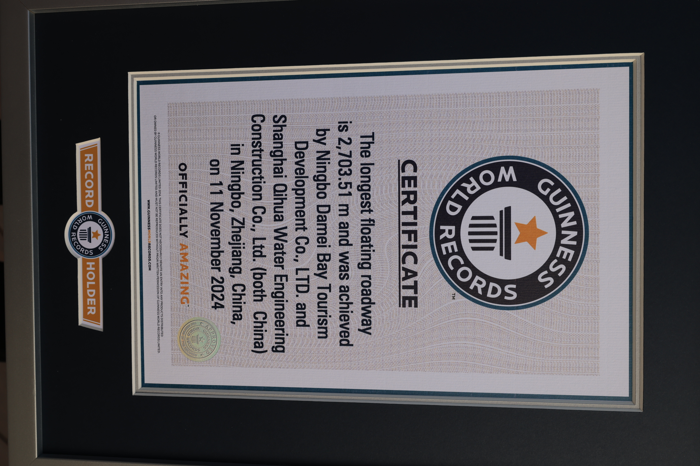 “经过前期的精心测量,我代表吉尼斯纪录很荣幸地宣布:“海上最长的可行车浮桥”最终测量结果是2703.51米,打破挑战目标。恭喜!挑战成功!”11月11日下午,伴随着激动人心的鼓点,吉尼斯世界纪录认证官杨绍鹏宣布了挑战结果,奉化天妃湖福桥桥获得“海上最长的可行车浮桥”吉尼斯世界纪录。记者了解到,天妃湖福桥将于11月12日正式通车,届时游客可乘坐接驳车上桥一睹宁波湾美景。