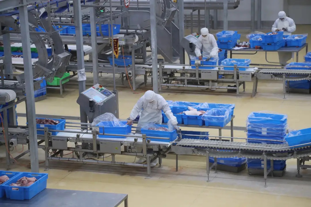 在现代化生猪屠宰智能5G工厂建设中,正大食品(徐州)有限公司投入资金2800万元,通过引进先进的屠宰设备、配置高端智能机器人、研发内部控制系统等“智改数转网联”举措,使产品品质、屠宰效率等有了质的飞跃,为企业提高市场占有率、提升品牌度提供了坚实支撑。“原来每人每小时的屠宰效率只能达到6头,使用自动化设备后,每人每小时的屠宰效率从6头提高到11头。”该公司生产总监刘江介绍。