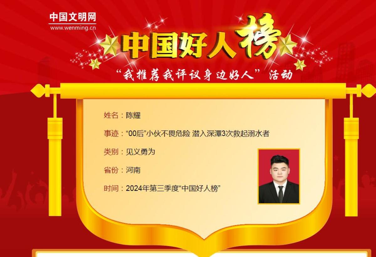 好人就在身边,善行来自于日常。由中央精神文明建设办公室主办的2024年第三季度“中国好人榜”发布仪式暨全国道德模范与身边好人现场交流活动,11月12日在湖北省十堰市举行,信阳大学生陈耀荣登2024年第三季度“中国好人榜”。