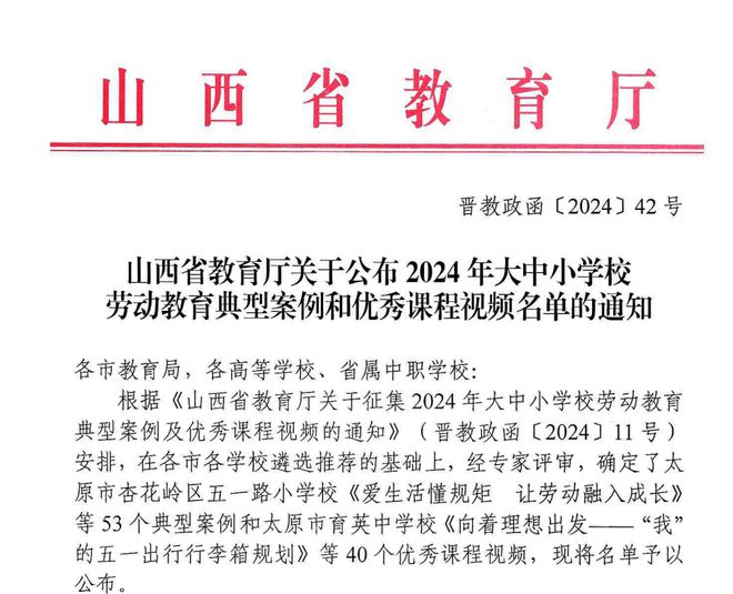 近日,山西省教育厅正式发布了《关于公布2024年大中小学校劳动教育典型案例及优秀课程视频名单的通告》,山西工程技术学院《劳动与创新创业》课程成功入选省优秀课程视频。