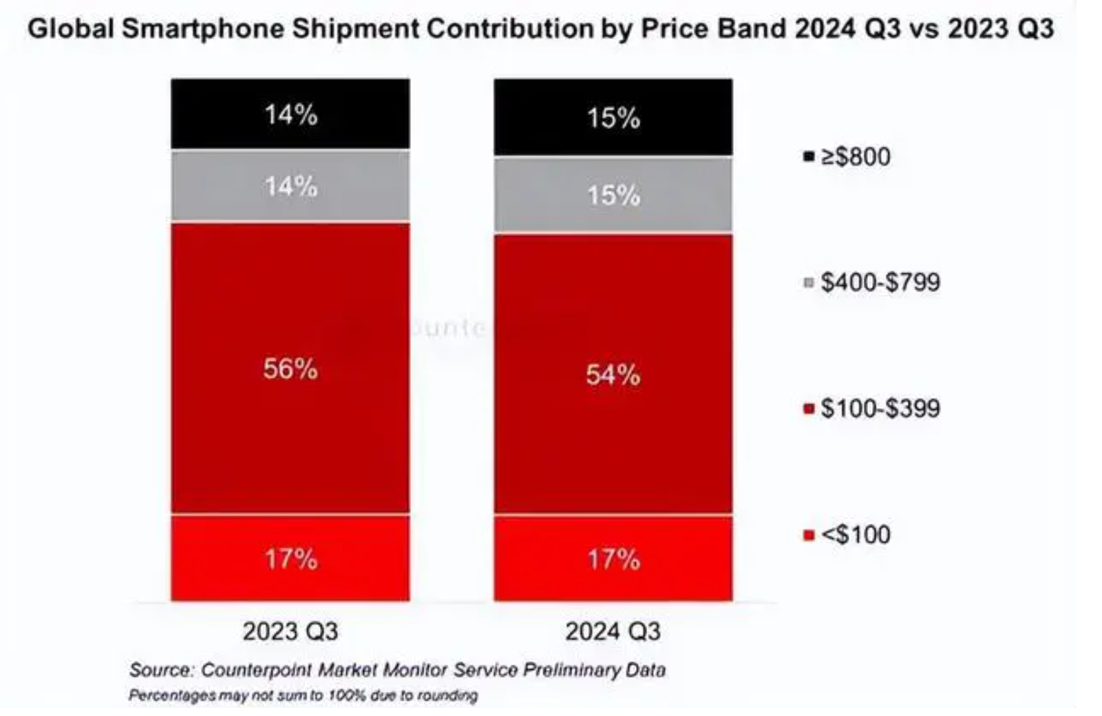 根机构数据,2024年第三季度全球智能手机出货量同比增长2%,而营收增长更是达到10%,创下历史最高的第三季度水平。这主要得益于高端化趋势的推动,特别是≥400美元的细分市场净份额同比上涨2%。