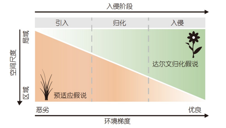 外来物种入侵可经历引入、定殖、归化和入侵等阶段,决定入侵成功的生态过程可能在各个阶段有所不同。研究显示,外来物种在入侵初期为了尽快融入集体,更倾向于选择与本土物种相似的生活环境,表现出预适应的特征;而在入侵后期,外来物种逐渐在新的环境中站稳脚跟,便开始寻找新的发展机会。为了避免与本土物种的激烈竞争,它们会逐渐向不同的生态位发展。