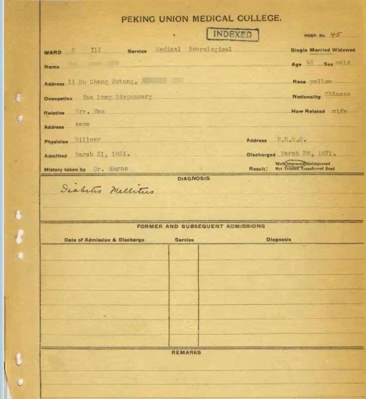 我们北京协和医院建院初期在糖尿病的治疗上可以说是和世界同步的。在我们的历史病案中,最早的一份糖尿病住院病历的病案号是45,入院时间是1921年3月;第一份用胰岛素治疗糖尿病的病历,病案号是5524,使用胰岛素的时间是1923年7月。