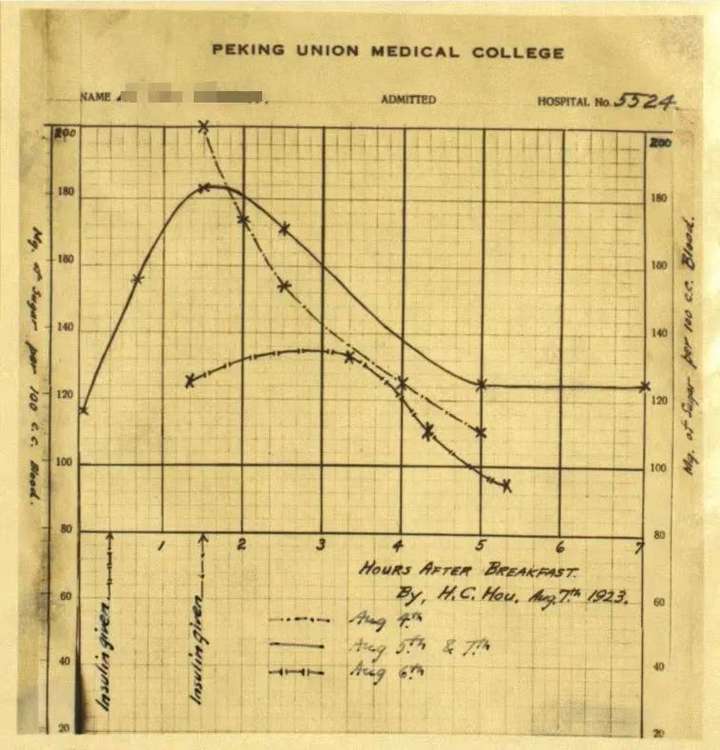 写病历的大夫是协和第一届毕业生侯祥川,当时是实习医生,他特地把血糖监测值在坐标纸上画成了曲线,注射胰岛素后未进餐的曲线、注射胰岛素后即刻进餐的曲线,都在这张坐标纸上一目了然。