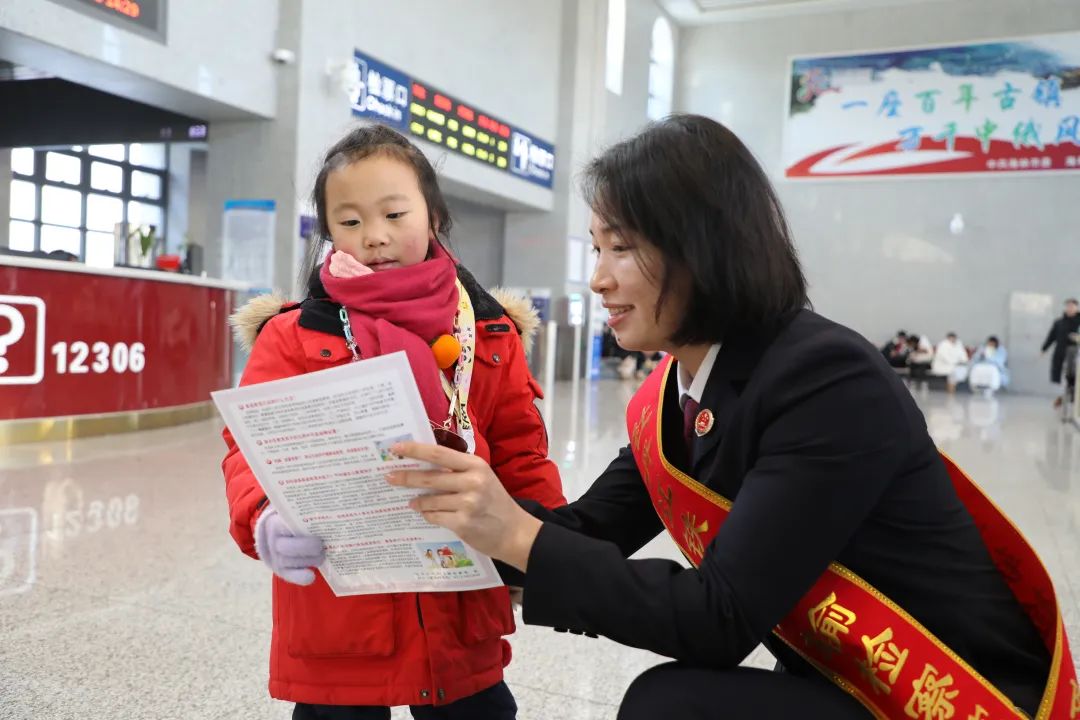 近日,牡丹江铁路运输检察院开展铁路沿线普法宣传活动,该院干警深入辖区横道河子站,通过发放宣传单、播放视频、现场答疑等方式,向未成年人及其家长普及未成年人保护相关法律法规。(韩兵 张华军摄)