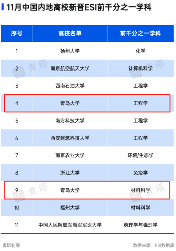 11月14日,科睿唯安最新公布的ESI数据显示,青岛大学材料科学、工程学两个学科同时进入全球排名前1‰,其中,材料科学是山东省属高校该学科中首个进入前1‰的学科。这是青岛大学在学科建设方面首次实现全球排名前1‰的历史性突破,标志着两个学科迈入国际顶尖行列。