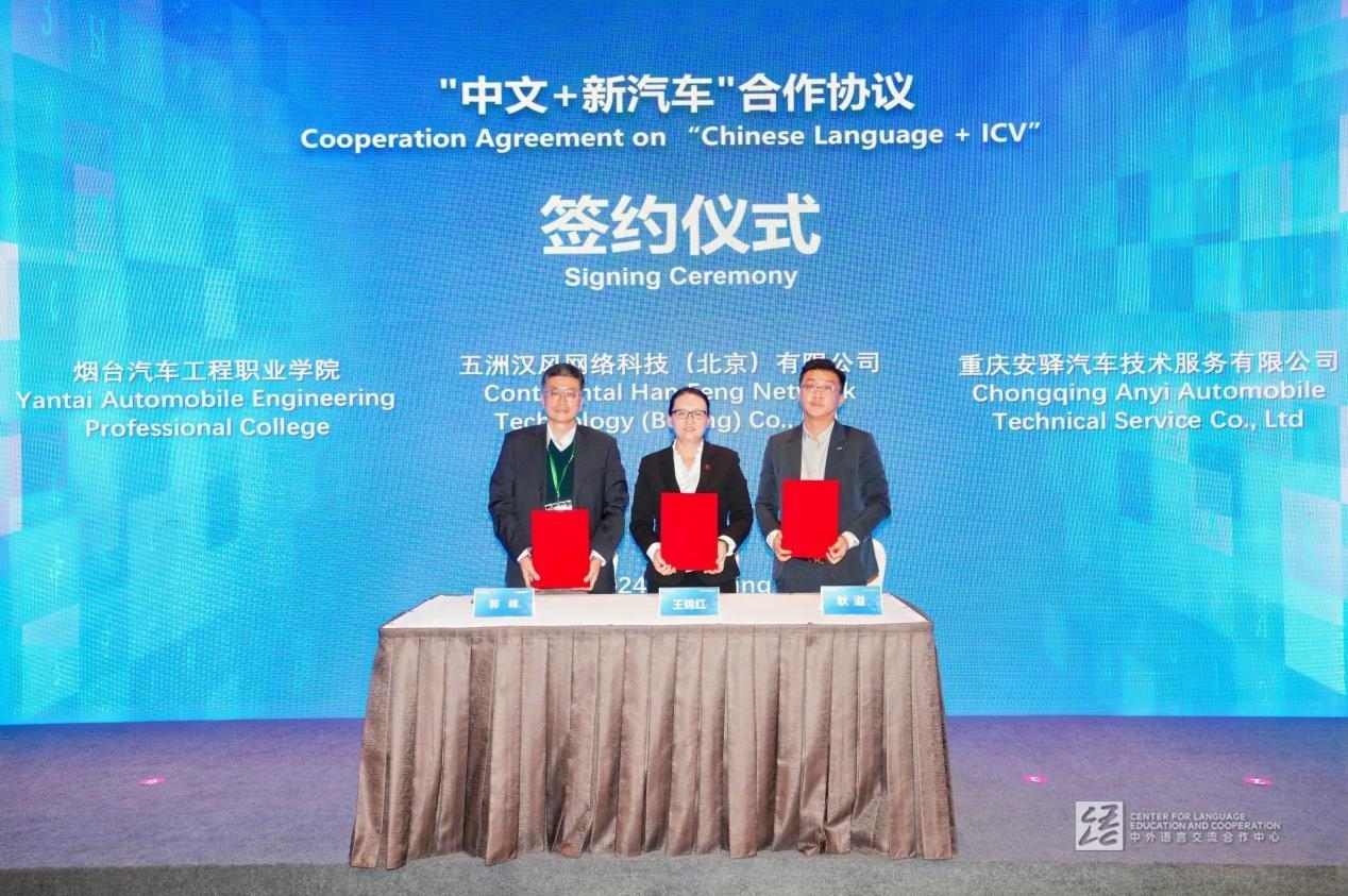 同时,烟台汽车工程职业学院联手五洲汉风网络科技(北京)有限公司、重庆安驿汽车技术服务有限公司成功签署了“中文+新汽车”合作协议,各方将整合资源,在中文职业教育课程开发、实践教学基地建设、国际学生联合培养和教育成果转化等关键领域展开多层面合作。