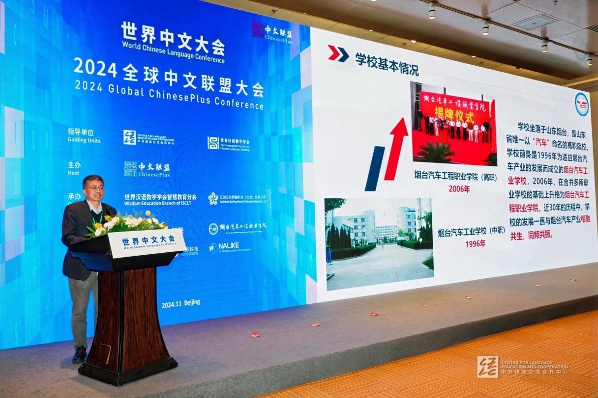 烟台汽车工程职业学院郭峰院长在2024世界中文大会的专项会议“2024全球中文联盟大会”上作了题为《基于汽车产业链的产教融合职业院校学生培养》的主旨报告。此专项会议由中文联盟主办,烟台汽车工程职业学院协办。