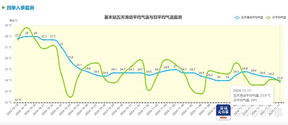 截至昨天(11月18日)深圳连续五天滑动平均气温为23.8℃,依然未达到入秋标准(连续五天滑动平均气温≤22℃即为入秋)。
