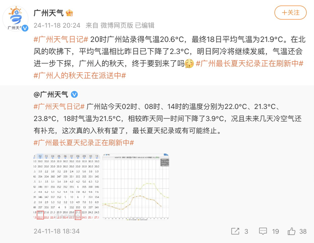 11月13日,广州打破了有气象记录以来最长夏天纪录,并持续刷新最长夏天纪录。昨天(18日)02时、08时、14时、18时、20时,广州站录得气温分别为22.0℃、21.3℃、23.8℃、21.5℃、20.6℃,最终18日平均气温为21.9℃,相比17日下降了2.3℃。